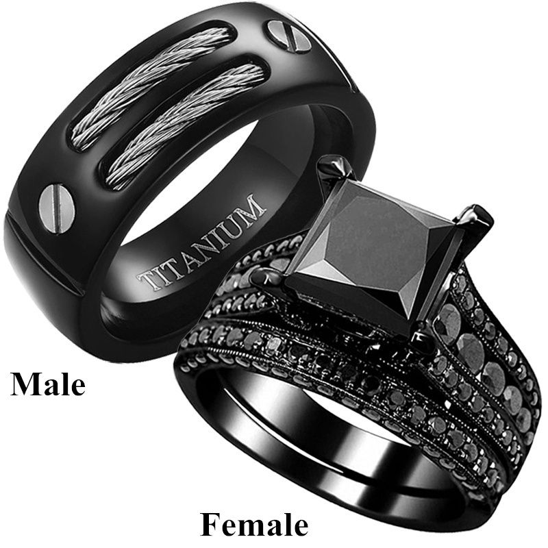 His Hers 3 Pcs Wedding Engagement Ring Set Black 9 Pcs Titanium